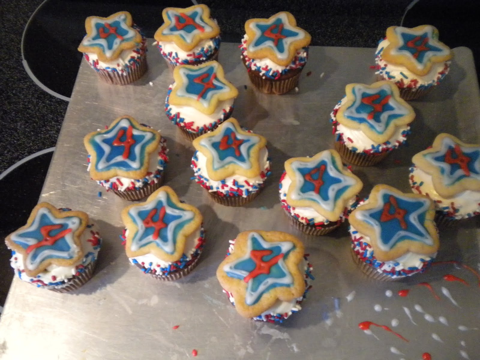 I guess I should preface all of this with some big news. I had a pacemaker put in on June 30th (the "bedrest" in "Cupcakes on Bedrest"), and baked cupcakes on July 3rd. Am I crazy? Probably. My left arm was strapped to my side so my boyfriend's mother helped with much of the grunt work. I used a random recipe with good ratings off the internet, and will look for another one or use my friend's recommendation the next time I attempt red velvet. As you'll see in the not-so-professional, last minute photographs, the cupcakes are brown. Did I use too much cocoa powder? too little food coloring? I simply don't know. The bottom line: the cupcakes tasted good, looked patriotic, and would've passed as german chocolate if I didn't tell anyone otherwise!