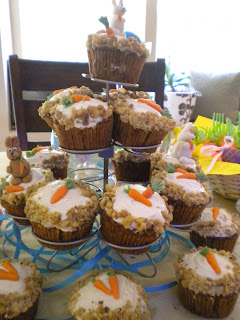 Let's move on to the cupcakes! Carrot Cake with traditional Cream Cheese frosting, rolled in chopped walnuts and accented with modeling chocolate carrots and bunnies :) They're precious and delicious. My new go-to Carrot Cake recipe is adapted from AllRecipe's Sam's Famous Carrot Cake. I also topped with Cream Cheese Frosting (lot's of cream cheese flavor.. only 2 cups of powdered sugar in this one!)