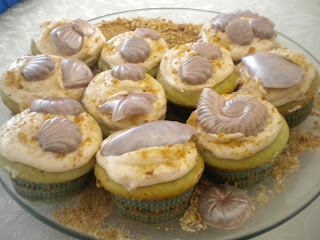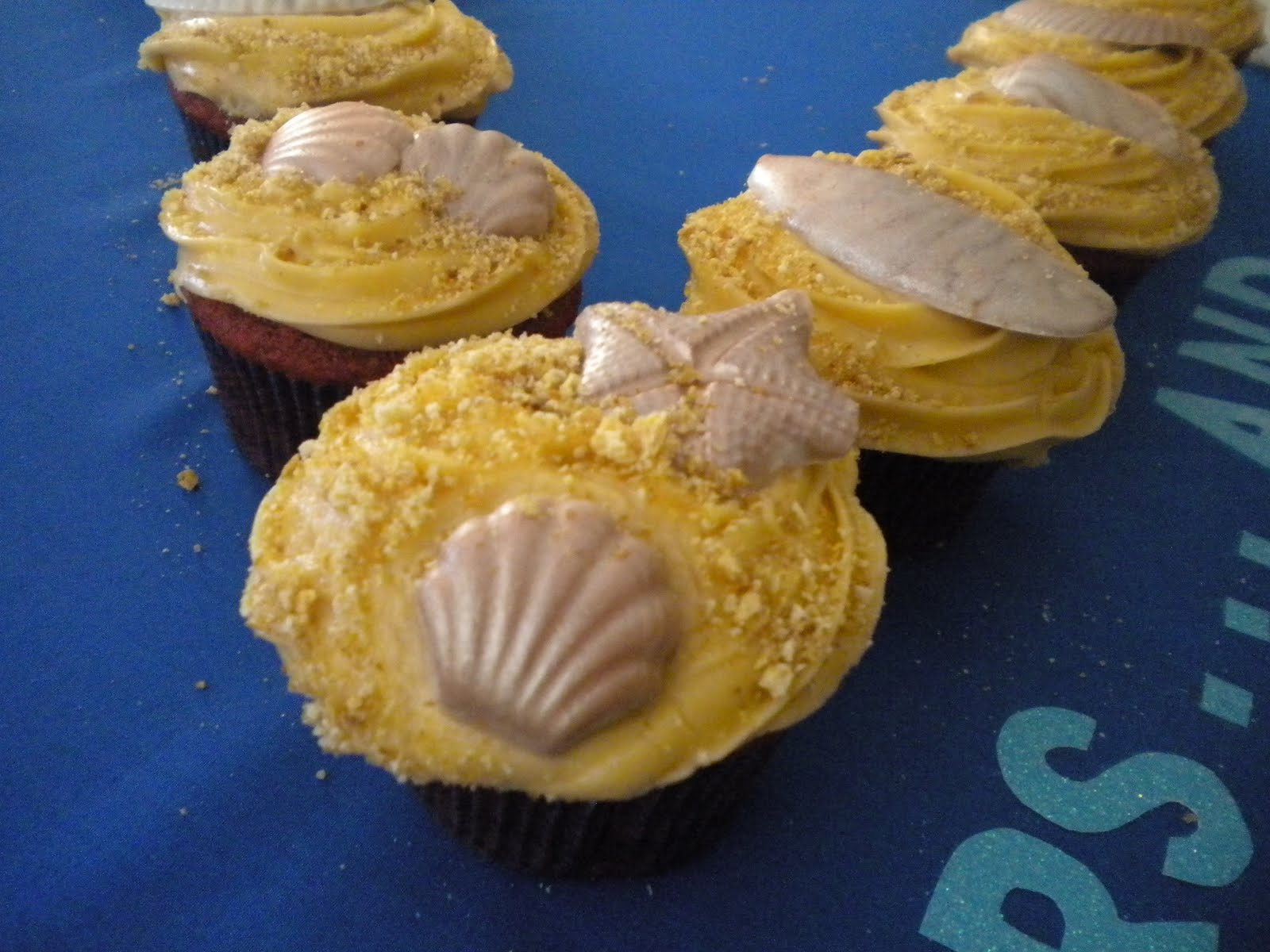 They were one-half of the cupcake creation I made for a celebration for my Uncle. The end of June marked a very special second anniversary for him, so we had a small party to celebrate! The party had a casual beach theme, so I took that and ran. Red velvet is his favorite flavor, so I knew I couldn't let him down. Presenting: red velvet cupcakes with cream cheese frosting, with hand-poured-and-painted chocolate seashells and brown sugar/graham cracker sand on top! I wish I had better pictures of the shells, they turned out pretty remarkable. You'll get the gist.